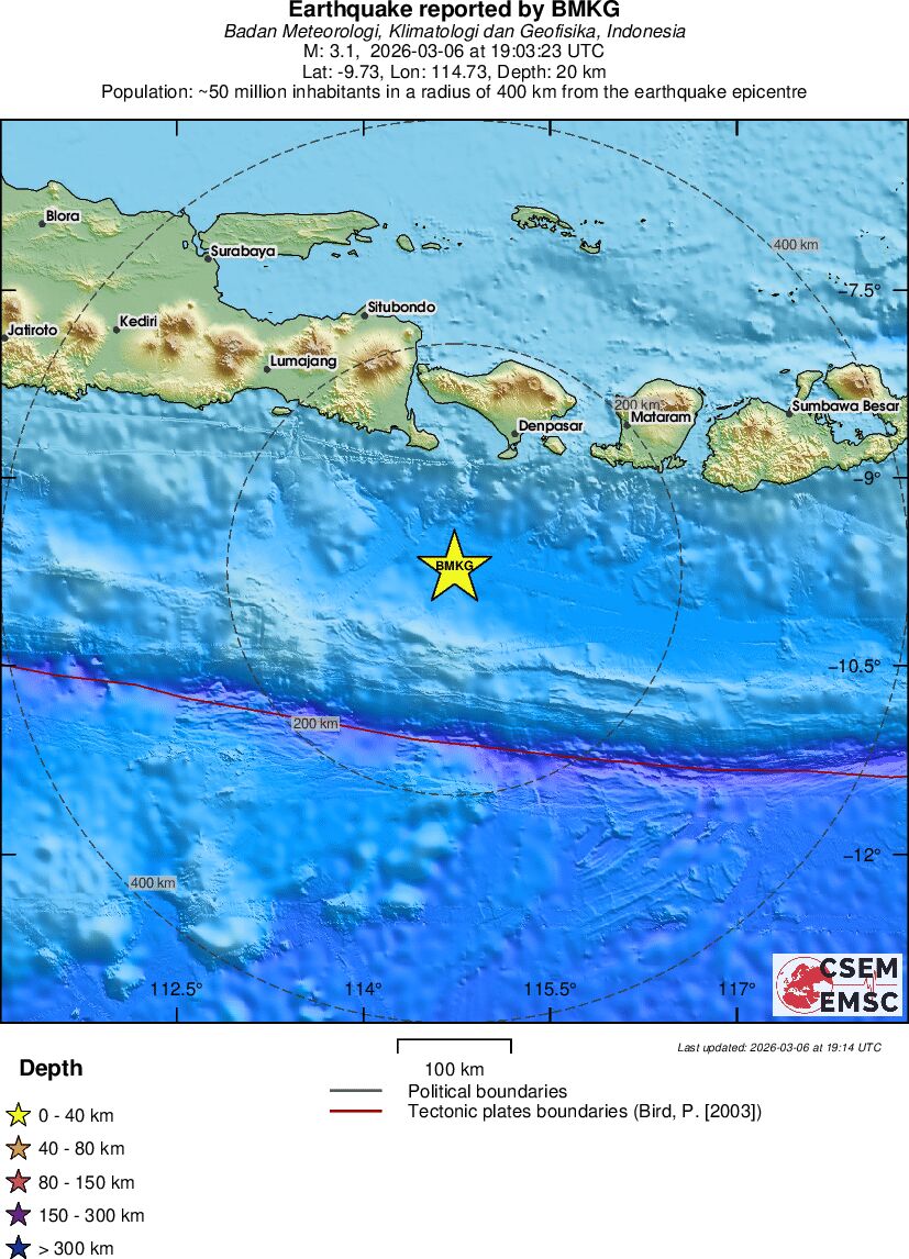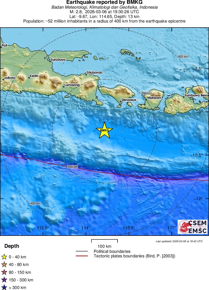 | 2.8 | 13 | 14466 | 19:30 | Linkki | Pieni maanjäristys- SOUTH OF BALI, INDONESIA - Tänään |