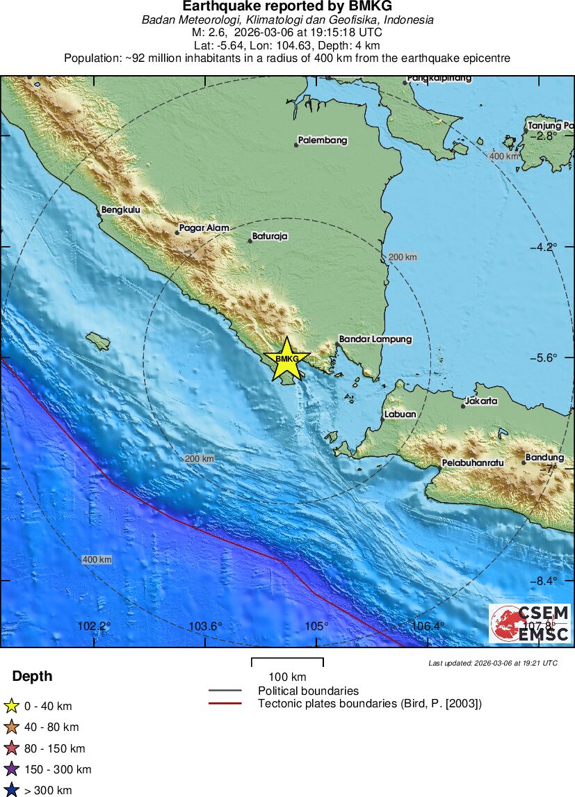 | 2.6 | 4 | 13304 | 19:15 | Linkki | Pieni maanjäristys- SOUTHERN SUMATRA, INDONESIA - Tänään |