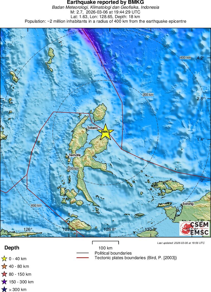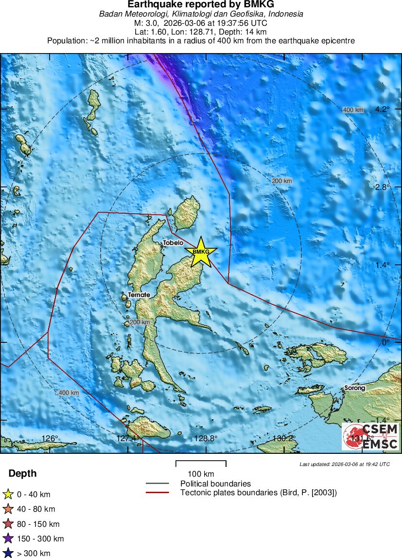 | 2.7 | 18 | 14775 | 19:44 | Linkki | Pieni maanjäristys- HALMAHERA, INDONESIA - Tänään |