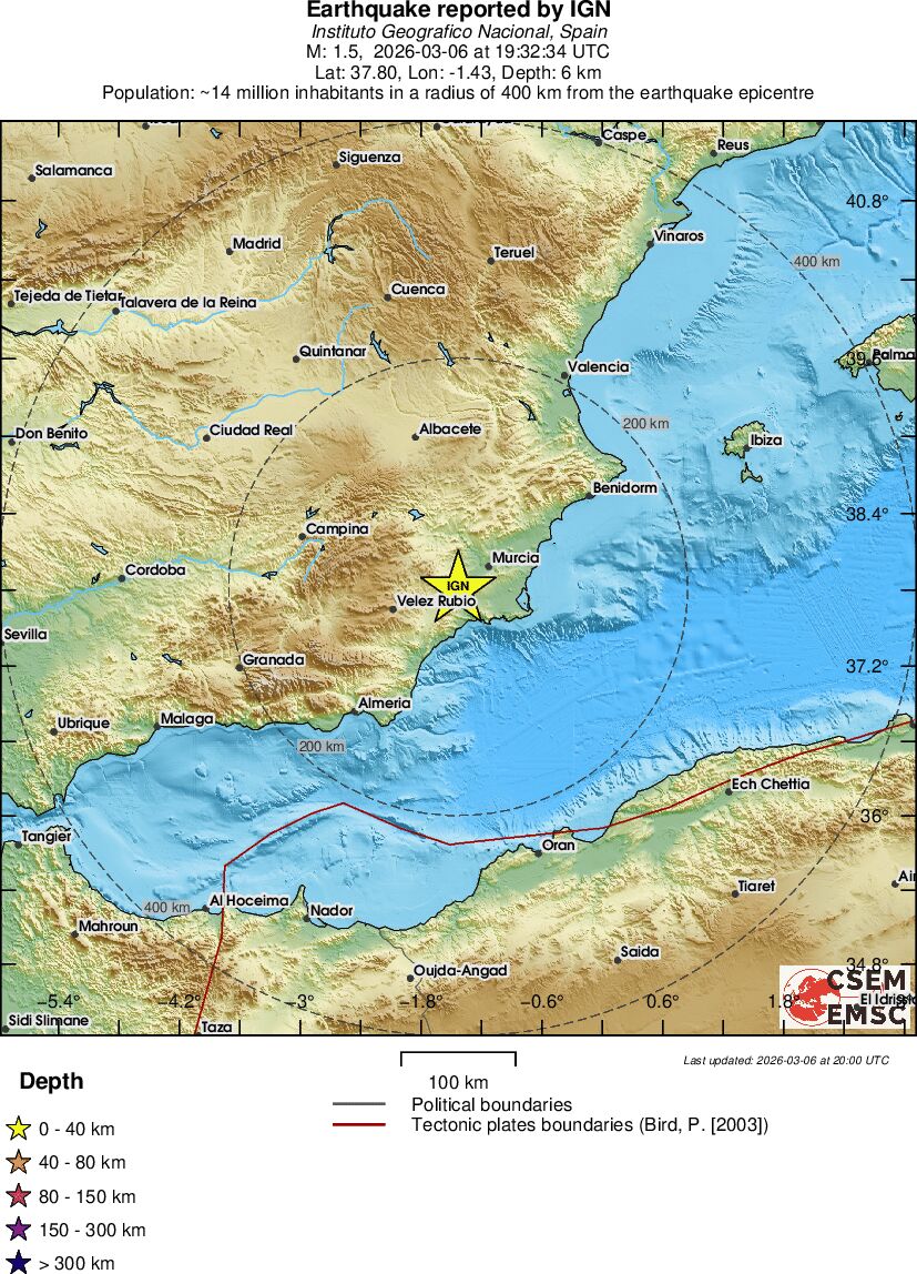 | 1.5 | 6.4 | 1535 | 19:32 | Linkki | Pieni maanjäristys- SPAIN - Tänään |