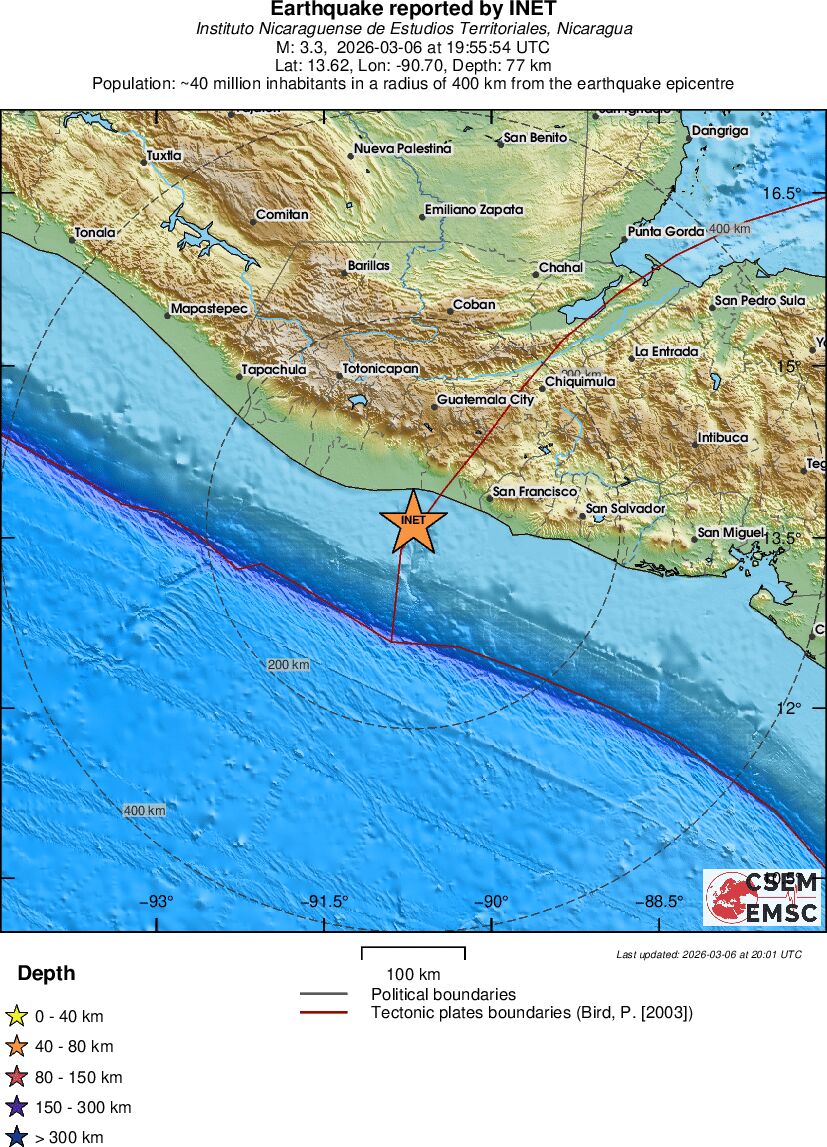 | 3.3 | 77 | 7665 | 19:55 | Linkki | Pieni maanjäristys- OFFSHORE GUATEMALA - Tänään |