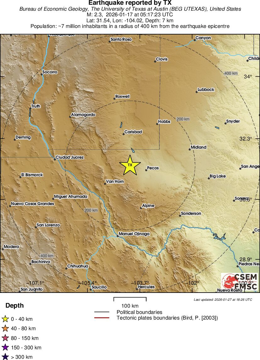 | 2.3 | 4.6 | 4919 | 05:17 | Länk | Mindre jordbävning- WESTERN TEXAS - I dag |