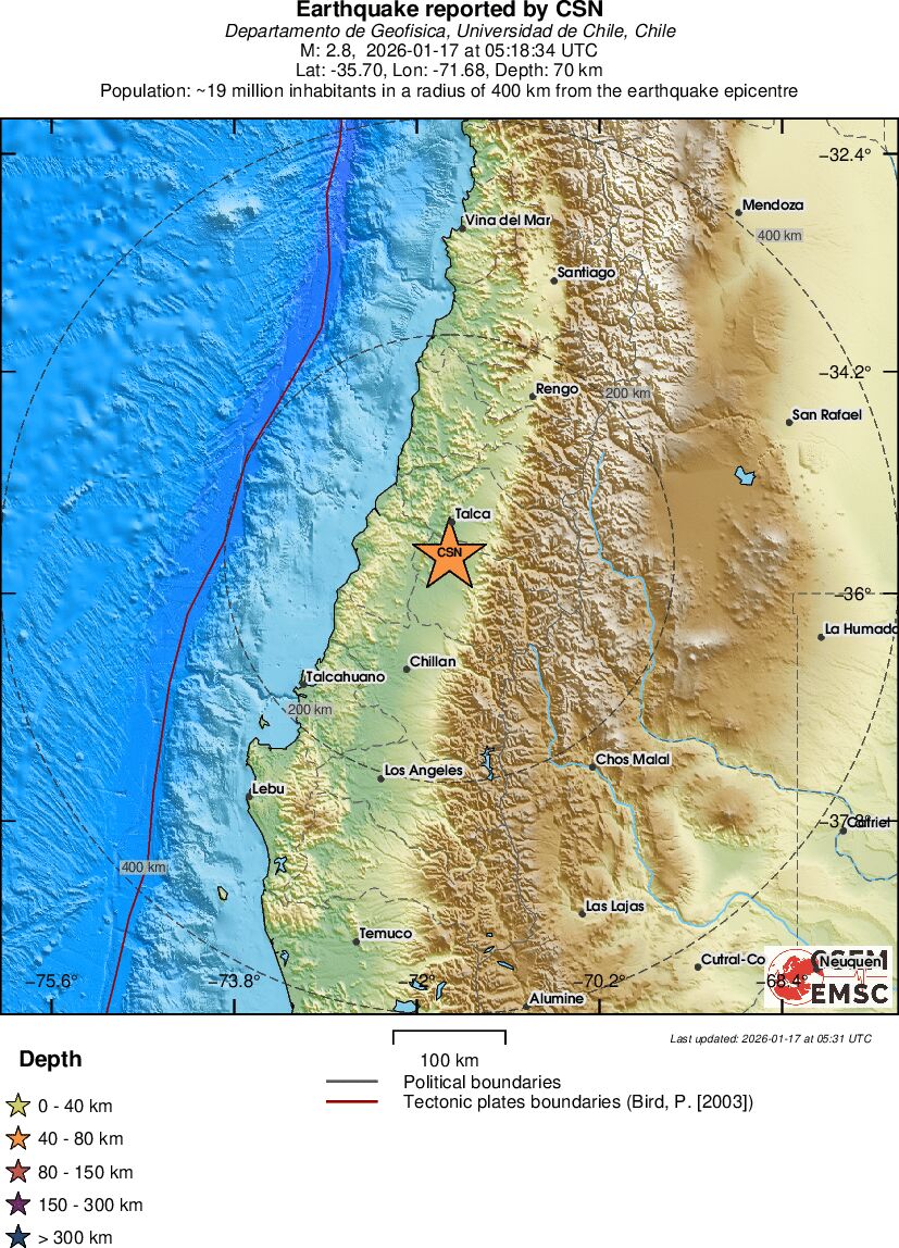 | 2.8 | 69.9 | 5896 | 05:18 | Länk | Mindre jordbävning- MAULE, CHILE - I dag |